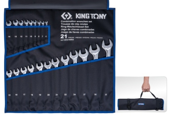 Klucze płasko-oczkowe King Tony 21 elementów w rozmiarach 6-32 mm. W zestawie klucze 1062: 6, 7, 8, 9, 10, 11, 12, 13, 14, 15, 16, 17, 18, 19, 20, 21, 22, 24, 27 30 ,32 mm. Całość w materiałowym etui do przechowywania i przenoszenia z poręcznym uchwytem.