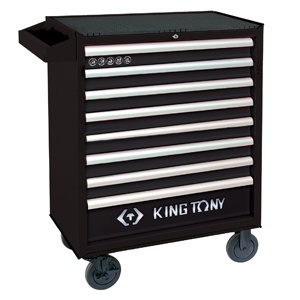 Wózek warsztatowy King Tony z 8 szufladami. Szuflady łożyskowane z wygodnym uchwytem, ładowność wózka 360kg, malowany proszkowo, centralny zamek, jednoczęściowy stalowy korpus, góra zabezpieczona 10 mm matą gumową, przemysłowe kółka z hamulcem do podłogi TPR Wymiary szuflad:7 x szer. 576 x gł. 380 x wys.75 mm 1 x szer. 576 x gł. 380 x wys.154 mm