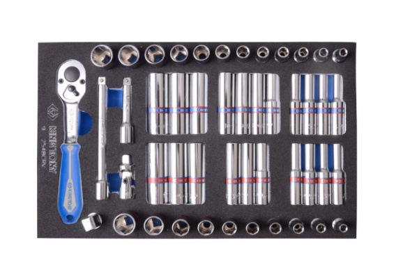 Zestaw NASADEK 1/4" 48cz. KRÓTKIE/DŁUGIE, 6-kąt. 4 - 13 mm, CALOWE 5/32"-1/2" Z AKCESORIAMI, CHROM, WKŁAD Z PIANKI DO WÓZKA. Wymiary wkładu: 163x263 mm