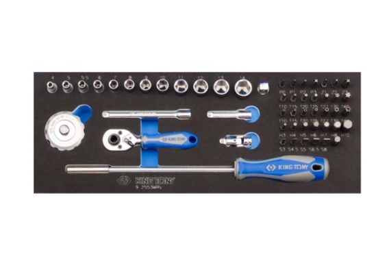 Zestaw narzędzi 1/4” King Tony we wkładzie z pianki o wymiarach 140 x 375 mm. W zestawie znajdują się narzędzia: bity 1/4” PH0, PH1, PH2, PH3, bity imbusy (HEX) H3, H4, H5, H6, H7, H8, H10, bity płaskie 3, 4.5, 5, 6.5, 8, bity 1/4” TORX w rozmiarach T10, T15, T20, T25, T27, T30, T40, bity 1/4” TORX z otworem w rozmiarach T10H, T15H, T20H, T25H, T27H, T30H, T40H, bity 1/4” POZDRIVE w rozmiarach PZ1, PZ2, PZ3, nasadki 1/4” krótkie 6-kątne w rozmiarach 4, 5, 5.5, 6, 7, 8, 9, 10, 11, 12, 13, 14 mm, przedłużki uchylne 1/4” o długości 55 i 100 mm, wkrętak do bitów 1/4” o długości 300 mm, grzechotka 1/4” 2w1 do nasadek i bitów (dwustronna) King Tony 276A-04G 72 zęby, pokrętło ręczne mini do bitów 1/4”, przegub kardana 1/4”, adapter 1/4” (żeński) na nasadki 3/8”, uchwyt na nasadki 1/4” do wkrętarek o długości 25 mm. Narzędzia wykonane są z wysokiej jakości stali chromo-wanadowej.