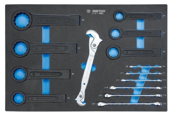 Nowość. Zestaw 14 narzędzi we wkładzie z pianki EVA do wózka warsztatowego King Tony, wymiary wkładu 560 x 375 mm. Wkład zestawu narzędzi wchodzą: klucze do pobijania oczkowe w rozmiarach: 24, 27, 30, 32, 36, 41, 46 mm; klucz uniwersalny zaciskowy 8-32 mm 3616-10 King Tony; klucze gwiazdkowe E-TORX w rozmiarach E6xE8, E7xE11, E10xE12, E14xE18, E16xE22, E20xE24.