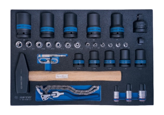 Zestaw narzędzi 31 cz. we wkładzie do wózka z pianki EVA 560 x 375 mm.Zestaw zawiera:- nasadki gwiazdkowe E 3/8" krótkie w rozmiarach: E4, E5, E6, E7, E8, E11,- nasadki gwiazdkowe E 1/2" krótkie w rozmiarach: E10, E12, E14, E16, E18, E20, E22,- nasadki udarowe gwiazdkowe E 3/4" w rozmiarach: E24, E26, E28, E30, E32,- nasadki z bitem HEX (imbus) 1/2" w rozmiarach: H14, H17, H19,- nasadki udarowe długie 1" 6-kątne w rozmiarach: 27, 30, 32, 33, 36,- redukcja udarowa 1" na 3/4",- adapter udarowy 1/2" na 3/4",- młotek 2000 g,- klucz do filtrów oleju o60~160 mm (320560),- próbnik obwodu 6~24V.