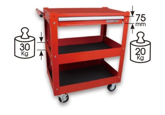 Wózek warsztatowy 1 szuflada, blat roboczy, 2 półki (bez narzędzi) - czerwony, prowadnice łożyskowane. Wymiary całkowite bez kółek: szer. 716 x gł. 410 x wys. 750 mm. Wymiary całkowite z kółkami: szer. 716 x gł. 410 x wys. 855 mm. Wymiary szuflady: szer. 569 x gł. 275 x wys. 75 mm