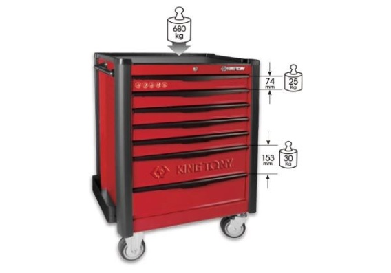 Wymiary ogólne wózka:z kółkami: wys.102 x szer. 82 x gł. 47 cm bez kółek: wys. 85 x szer. 82 x gł. 47 cm5 szuflad o wymiarach: 576 x 380 x 74 mm (ładowność 1 szuflady - 25 kg) 2 szuflady o wymiarach: 576 x 380 x 153 mm (ładowność 1 szuflady - 30 kg) Wymiary kółek: 5” x 2” Ładowność: 680 kg. Wyposażenie wózka: uchwyt - rączka boczna, 4 haki, dodatkowa półka z boku. Miękkie ochraniacze na narożnikach. Przemysłowe kółka TPR z hamulcem. Łożyskowane szuflady z blokadą zabezpieczającą przed przypadkowym wysunięciem. Centralny zamek.