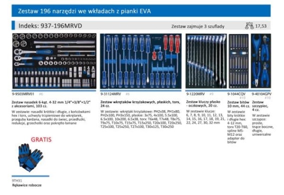 Moduł 1: nasadki długie 6-kątne 1/4" w rozmiarach 4, 4.5, 5, 5.5, 6, 7, 8, 9, 10, 11, 12, 13 mm, nasadki krótkie 6-kątne 1/4" w rozmiarach 4, 4.5, 5, 5.5, 6, 7, 8, 9, 10, 11, 12, 13 mm, nasadki z bitem TORX 3/8" o długości 50 mm: T10, T15, T20, T25, T27, T30, T40, T45, T50, nasadki z bitem HEX 3/8" o długości 50 mm: H3, H4, H5, H6, H8, H10, H12, nasadki długie 6-kątne 3/8" w rozmiarach 10, 12, 13, 14, 15, 16, 17, 18, 19, 21 mm, nasadki krótkie 6-kątne 3/8" w rozmiarach 8, 10, 11, 12, 13, 14, 15, 16, 17, 18, 19, 20, 21, 22 mm, nasadki do świec 6-kątne 3/8" w rozmiarach 16, 21 mm, nasadka do świec 12-kątna 3/8" 14 mm, nasadki krótkie 6-kątne 1/2" w rozmiarach 10, 12, 13, 14, 15, 16, 17, 18, 19, 20, 21, 22, 23, 24, 27, 28, 30, 32 mm, grzechotka 1/4" z przyciskiem zwalniającym 24 zęby, grzechotka 1/4" z przyciskiem zwalniającym 32 zęby, grzechotka 1/4" z przyciskiem zwalniającym 32 zęby, przedłużki 1/4" 54, 100 mm, 3/8" 75, 250 mm, 1/2" 125, 250 mm, przegub kardana 1/4", 3/8", 1/2", pokrętło łamane 1/2", adapter 1/4" na 3/8", redukcje 3/8" na 1/4" oraz 1/2" na 3/8", uchwyt trzpieniowy do wkrętarek 1/4" na nasadki 1/4" oraz 3/8", długość 50 mm. (moduł 9-9503MRV01)