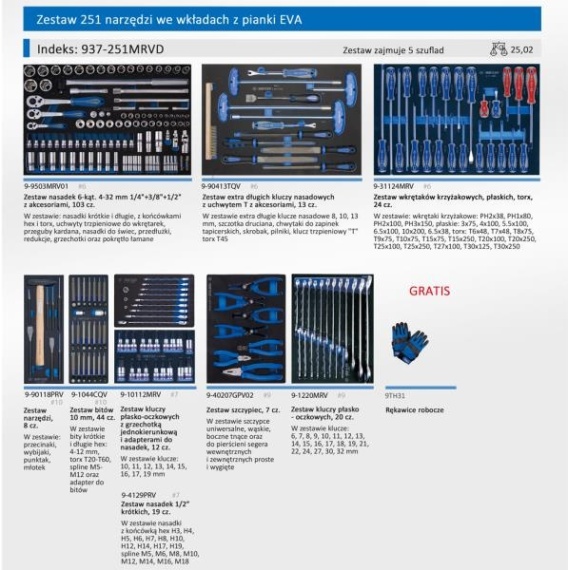 Moduł 1: nasadki długie 6-kątne 1/4" w rozmiarach 4, 4.5, 5, 5.5, 6, 7, 8, 9, 10, 11, 12, 13 mm, nasadki krótkie 6-kątne 1/4" w rozmiarach 4, 4.5, 5, 5.5, 6, 7, 8, 9, 10, 11, 12, 13 mm, nasadki z bitem TORX 3/8" o długości 50 mm: T10, T15, T20, T25, T27, T30, T40, T45, T50, nasadki z bitem HEX 3/8" o długości 50 mm: H3, H4, H5, H6, H8, H10, H12, nasadki długie 6-kątne 3/8" w rozmiarach 10, 12, 13, 14, 15, 16, 17, 18, 19, 21 mm, nasadki krótkie 6-kątne 3/8" w rozmiarach 8, 10, 11, 12, 13, 14, 15, 16, 17, 18, 19, 20, 21, 22 mm, nasadki do świec 6-kątne 3/8" w rozmiarach 16, 21 mm, nasadka do świec 12-kątna 3/8" 14 mm, nasadki krótkie 6-kątne 1/2" w rozmiarach 10, 12, 13, 14, 15, 16, 17, 18, 19, 20, 21, 22, 23, 24, 27, 28, 30, 32 mm, grzechotka 1/4" z przyciskiem zwalniającym 24 zęby, grzechotka 1/4" z przyciskiem zwalniającym 32 zęby, grzechotka 1/4" z przyciskiem zwalniającym 32 zęby, przedłużki 1/4" 54, 100 mm, 3/8" 75, 250 mm, 1/2" 125, 250 mm, przegub kardana 1/4", 3/8", 1/2", pokrętło łamane 1/2", adapter 1/4" na 3/8", redukcje 3/8" na 1/4" oraz 1/2" na 3/8", uchwyt trzpieniowy do wkrętarek 1/4" na nasadki 1/4" oraz 3/8", długość 50 mm. (moduł 9-9503MRV01)