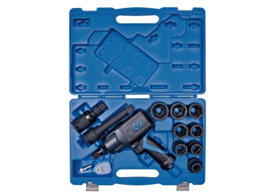 W zestawie: nasadki w rozmiarach 19, 22, 24, 27, 30, 32, 36, 38 mm, klucz udarowy, przedłużka, złączka, adapter wlotu powietrza.