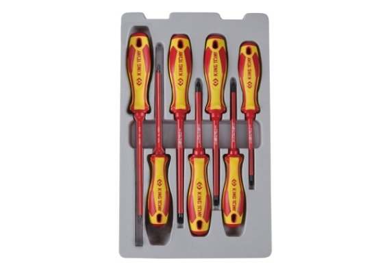 Zestaw wkrętaków izolowanych VDE King Tony. W zestawie znajdują się śrubokręty w rozmiarach: krzyżak PH1 x 100, PH2 x 100, płaskie 4 x 100, 5.5 x 125, 6.5 x 150 mm, kwadrat RB1 x 125, RB2 x 150. Wkrętaki wykonane są z wysokiej jakości stali stopowej SNCM + V, a rękojeść z dwukomponentowego tworzywa PP + TPR. Część robocza jest chromowana z czernioną końcówką. Narzędzia spełniają normę IEC 60900:2012.