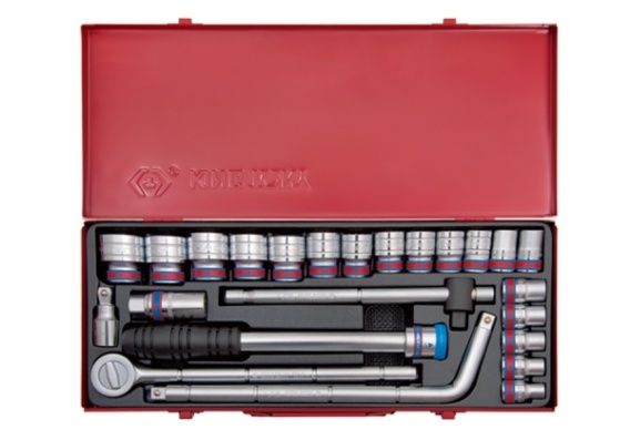 Zestaw narzędzi 1/2" King Tony w metalowej kasecie. W zestawie znajdują się nasadki krótkie, 12-kątne, calowe, nasadka do świec 21 mm 12-kątna, grzechotka wraz z przedłużką do grzechotki, pokrętło przesuwne oraz pokrętło typu L. Nasadki w rozmiarach calowych: 3/8", 7/16", 15/32", 1/2", 9/16", 19/32", 5/8", 11/16", 3/4", 25/32", 13/16", 7/8", 15/16", 1", 1-1/16", 1-1/8", 1-3/16", 1-1/4"