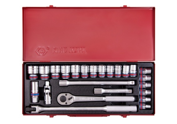 Zestaw narzędzi 1/2" King Tony w metalowej kasecie. W zestawie znajdują się calowe nasadki, krótkie, 12-kątne[ mm ]: 5/16", 3/8", 7/16", 15/32", 1/2", 9/16", 19/32", 5/8", 11/16", 3/4", 25/32", 13/16", 7/8", 15/16", 1", 1-1/16", 1-3/16", 1-1/4", nasadka do świec 12-kątna, 21 mm, grzechotka z moletowanym uchwytem, pokrętło łamane, dwie chromowane przedłużki oraz przegub Kardana