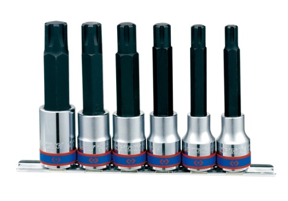 Zestaw nasadek 1/2" z końcówką RIBE King Tony. W zestawie znajduje się 6 długich nasadek oraz szyna, długości 180 mm, do wygodnego powieszenia na ścianie. Rozmiary nasadek: M9, M10, M12, M13, M14, M16. Nasadki wykonane ze stali chromowo-wanadowej, polerowane i chromowane, bity ze stali chromowo-molibdenowej.