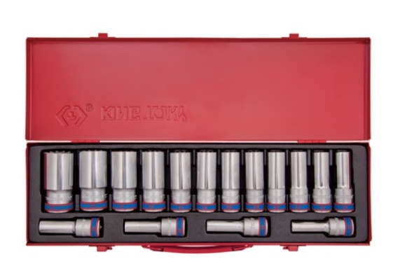 Zestaw długich nasadek 1/2" King Tony. W zestawie znajdują się nasadki długie, 12-kątne w rozmiarach: 10, 11, 12, 13, 14, 15, 16, 17, 18,19, 21, 22, 24, 27, 30, 32. Zestaw w metalowej walizeczce.