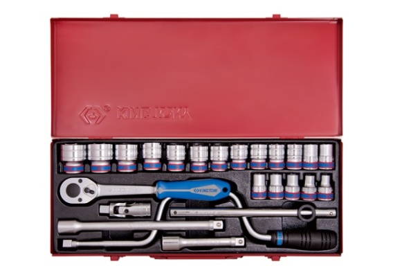 Zestaw narzędzi 1/2" firmy King Tony w metalowej walizce. W skład kompletu wchodza nasadki krótkie, 6-kątne w rozmiarach [ mm ]: 10-24, 27, 30, 32, grzechotka z gumową rączką, pokrętło przesuwne, pokrętło korbowe, przegub Kardana oraz dwie przedłużki