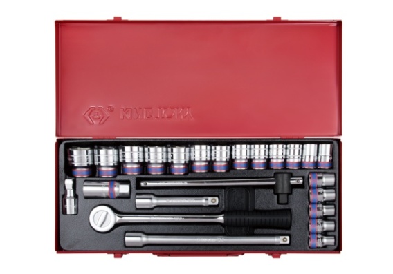 W zestawie nasadki 1/2" 6-kątne w rozmiarach: 10, 11, 12, 13, 14, 15, 16, 17, 18, 19, 20, 21, 22, 23, 24, 27, 30, 32 mm, nasadka do świec 21 mm, grzechotka 45 zębów, pokrętło przesuwne 250 mm, przedłużka uchylna 55 mm, przedłużka 125 i 250 mm