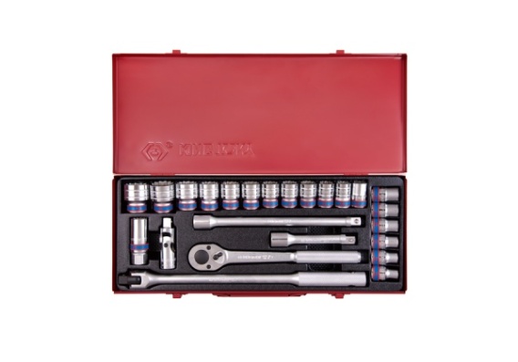 Zestaw narzędzi 1/2" King Tony w metalowej kasecie. W zestawie znajdują się metryczne nasadki, krótkie, 6-kątne[ mm ]: 10, 11, 12, 13, 14, 15, 16, 17, 18, 19, 20, 21, 22, 23, 24, 27, 30, 32, nasadka do świec 6-kątna, 21 mm, grzechotka z moletowanym uchwytem, pokrętło łamane, dwie chromowane przedłużki oraz przegub Kardana