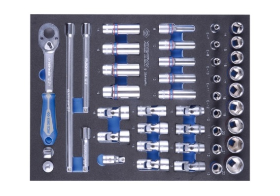 9-3544MRV - ZESTAW NASADEK 3/8" 44cz. KRÓTKIE 6-kąt.10-22mm,DŁUGIE 12-kąt. 8-19mm, Z AKCESORIAMI, WKŁAD Z PIANKI EVA DO WÓZKA