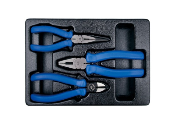 Zestaw szczypiec we wkładzie do wózka warsztatowego King Tony. W zestawie znajdują się standardowe kombinerki, cążki obcinające oraz szczypce wąskie