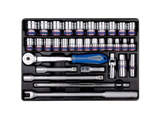 Zestaw narzędzi 1/2" we wkładzie do wózka narzędziowego. W zestawie znajdują się nasadki krótkie, 6-kątne 8, 9, 10, 11, 12, 13, 14, 15, 16, 17, 18, 19, 20, 21, 22, 23, 24, 25, 26, 27, 28, 29, 30, 32, dwie 6-kątne nasadki do świec, przegub Kardana, trzy przedłużki, pokrętło łamane, pokrętło przesuwne oraz grzechotka z gumową rączką