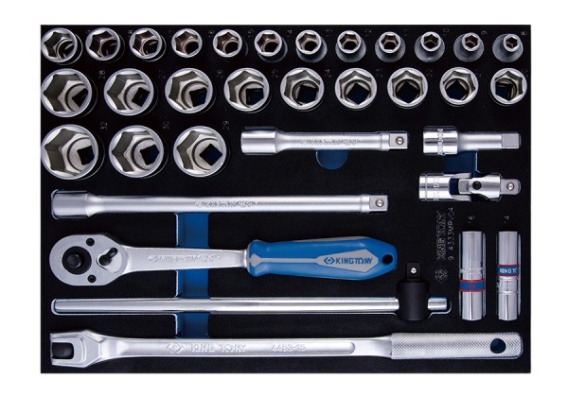Zestaw narzędzi 1/2” King Tony 33 elementy, wkład do wózka warsztatowego. W skład zestawu wchodzą nasadki krótkie 6-kątne 1/2” w rozmiarach 8, 9, 10, 11, 12, 13, 14, 15, 16, 17, 18, 19, 20, 21, 22, 23, 24, 25, 26, 27, 28, 29, 30, 32 mm, grzechotka 1/2”, pokrętło przesuwne i łamane 1/2”, przegub kardana, przedłużki 1/2” o długości 75, 125, 250 mm, klucze do świec 1/2” 12-kątne w rozmiarze 14 i 16 mm. Wymiary wkładu z pianki EVA 375 x 280 mm.