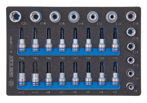 9-7128PRV - ZESTAW NASADEK 3/8" + 1/2", HEX H3 - H12, TORX T15 + T50, GWIAZDKI E8 - E20, WKŁAD Z PIANKI, DO WÓZKA