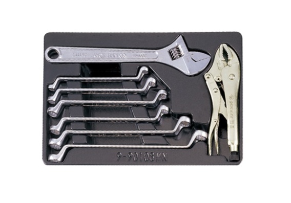 Zestaw kluczy oczkowych odgiętych wraz z kluczem nastawnym oraz szczypcami typu "mors". Zestaw we wkładzie do wózka warsztatowego zawiera klucze oczkowe o rozmiarach 8x10, 10x12, 11x13, 12x14, 14x17, 17x19.