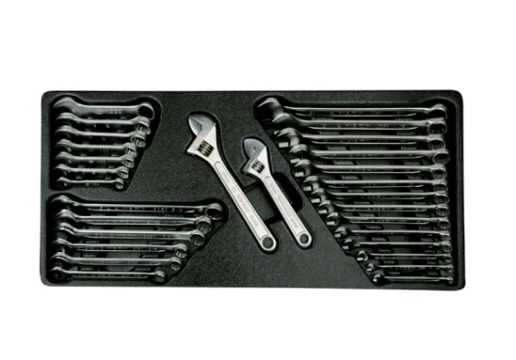 ZESTAW 29 CZ. KLUCZE PŁASKO-OCZKOWE METRYCZNO/CALOWE + KLUCZ NASTAWNE, WKŁAD DO SKRZYNKI