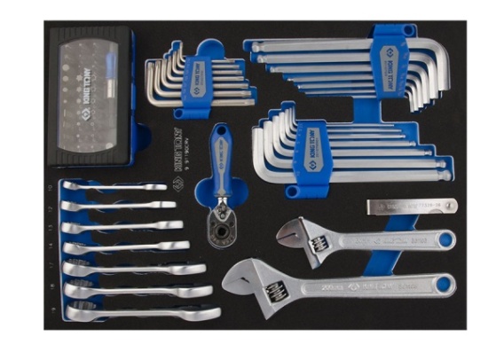 W zestawie bity: krzyżakowe, płaskie, HEX, kwadrat, pozidriv, SPLINE i TORX, długie imbusy HEX z kulką metryczne i calowe oraz imbusy TORX z otworem, krókie klucze płasko- oczkowe,klucze nastawne „szwed” z podziałką, uchwyt trzpieniowy do wkrętarek, magnetyczny uchwyt bitów do wkrętarek, szczelinomierze oraz mini grzechotka.