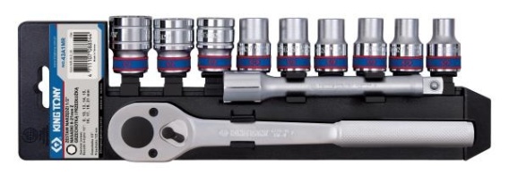 Zestaw nasadek 1/2" 6-kątnych z grzechotką King Tony 43A1MR z plastikową zawieszką. Zestaw zawiera:- nasadki 6-kątne 1/2" krótkie w rozmiarach: 8, 10, 13, 14, 15, 16, 17, 19, 21 mm, nasadki wykonane są ze stali chromowo-wanadowej, chromowane- grzechotka 1/2" 32 zęby - 11°, wykonana z zestali chromowo-wanadowej, a jej napęd z ze stali chromowo-molibdenowej- przedłużka 1/2" o długości 125 mm, wykonana ze stali chromowo-wanadowej