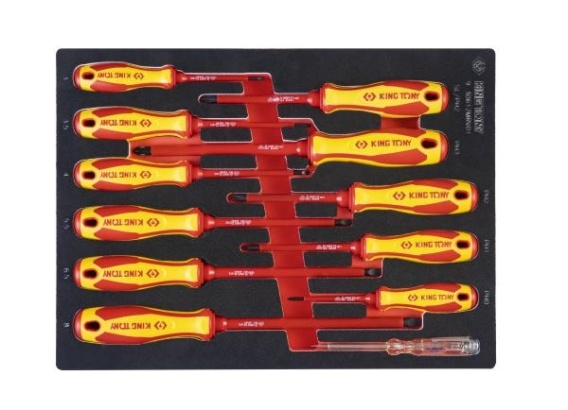 WKŁAD Z PIANKI EVA DO WÓZKAW zestawie:- wkrętaki krzyżakowe izolowane: PH0x75, PH1x100, PH2x100, PH3x150, PZ2x100- wkrętaki płaskie izolowane: 3x75, 3,5x100, 4x100, 5,5x125, 6,5x150, 8x175- próbnik napięcia 6CB02.