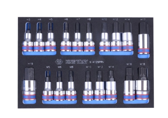 Zestaw nasadek 1/2" z bitem 9-4129PRV King Tony, wkład do wózka z pianki EVA o wymiarach 280 x 187 mm. W skład zestawu wchodzą narzędzia: