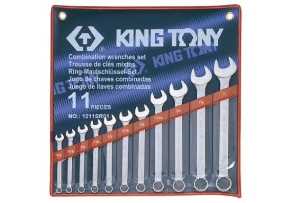 Zestaw calowych kluczy płasko-oczkowych King Tony. 11 części. Rozmiary: 1/4", 5/16", 3/8", 7/16", 1/2", 9/16", 5/8", 11/16", 3/4", 7/8", 1". Etui do powieszenia na ścianie
