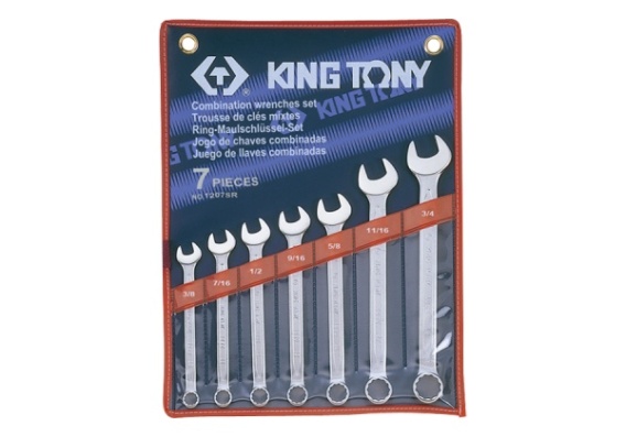 Zestaw calowych kluczy płasko-oczkowych King Tony. W skład zestawu wchodzą klucze 3/8", 7/16", 1/2", 9/16", 5/8", 11/16" oraz 3/4". Zestaw w etui ze wzmacnianymi uchwytami do powieszenia na ścianie.