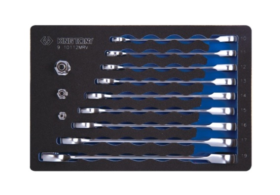Zestaw kluczy płasko-oczkowych z grzechotką jednokierunkową. Wkład piankowy pasujący do wózków warsztatowych King Tony. W zestawie znajdują się klucze 3731M w rozmiarach 10, 11, 12, 13, 14, 15, 16, 17, 19 oraz 3 uchwyty do nasadek, które umożliwiają zmianę odpowiednich kluczy z zestawu w proste grzechotki.